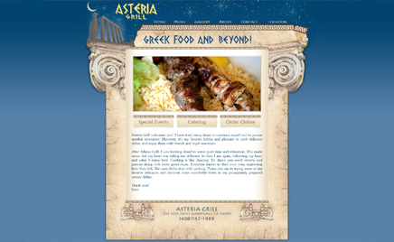 | | 14AsteriaGrill.com Для дизайна сайта ресторана греческой кухни Asteria Grill (США) мы использовали традиционные декоративные элементы со стилизованными шрифтами.