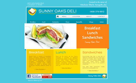 | | 6SunnyOaksDeli.com Очень радостный вебсайт для кафе Sunny Oaks Deli (Кэмпбел, США). Владелец хотел яркий дизайн сайта, который бы соответствовал «солнечному» названию кафе.