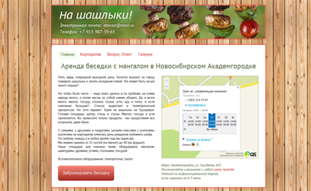 | | 2на-шашлыки.рф Задача: полный редизайн сайта. Компания Open Air предлагает в аренду площадку для шашлыка. На сайте можно ознакомиться с предлагаемыми услугами и забронировать площадку.