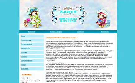 3AlisaNsk.ru Задача: поправить дизайн сайта. У компании "Алиса", предлагающей услуги по подбору домашнего персонала, сайт был давно. Но выглядел странно. Мы улучшили навигацию, поправили дизайн, починили контактную форму.