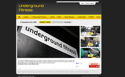 7UndergroundFitnessClub.com Фитнес-клуб Underground Fitness хотел, чтобы дизайн соответствовал названию клуба, поэтому выбрал черно-серые тона. Необходимо было создать страницы о тренерах, занятиях, добавить возможность оплаты абонемента через сайт.